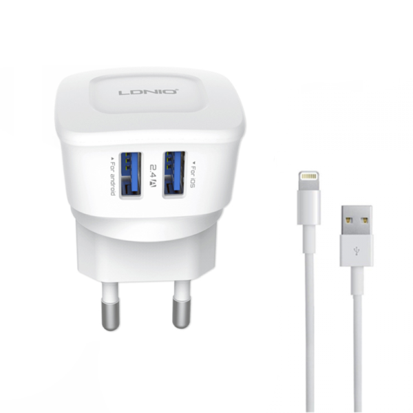 Φορτιστής δικτύου, LDNIO DL-AC56, 5V / 2.4A, 2 θύρες USB, καλώδιο Lightning (iPhone 5/6/7), λευκό – 14464