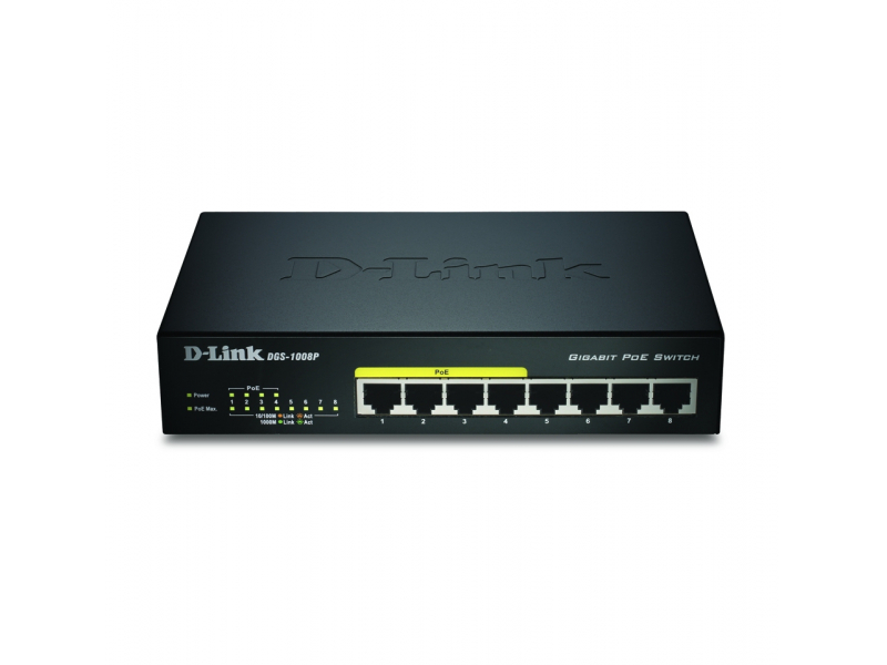 D-Link DGS-1008P/E. Switch layer L2. Basic switching RJ-45 Ethernet ports quantity 8. Full duplex. MAC address table 4000 entries, Switching capacity 16 Gbit/s. Networking standards IEEE 802.1p,IEEE 802.3,IEEE 802.3ab,IEEE 802.3af,IEEE 802.3u,IEEE 802.3x. Power connector DC-in jack. Power over Ethernet (PoE)