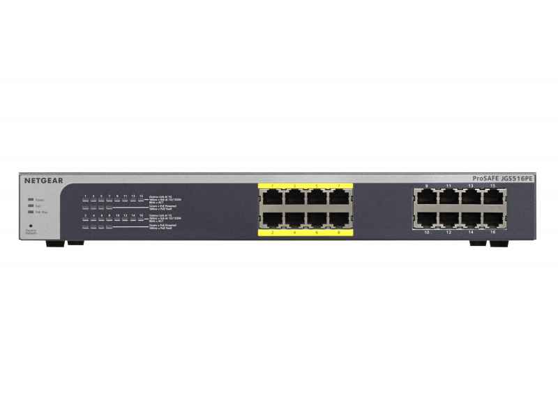 Netgear ProSafe Plus JGS516PE. Switch type Unmanaged network switch, Switch layer L3. Basic switching RJ-45 Ethernet ports type Gigabit Ethernet (10/100/1000), Basic switching RJ-45 Ethernet ports quantity 16. Full duplex. MAC address table 16000 entries, Switching capacity 32 Gbit/s. Networking standards IEEE 802.1p,IEEE 802.1Q,IEEE 802.3,IEEE 802.3ab,IEEE 802.3af,IEEE 802.3u,IEEE 802.3x. Power connector DC-in jack. Power over Ethernet (PoE). Rack mounting